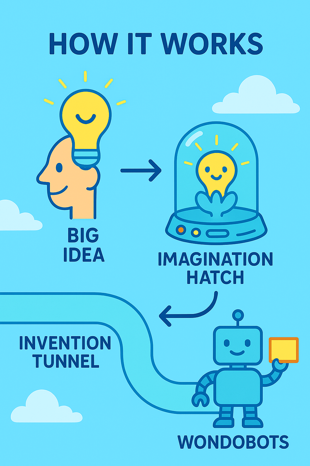 Once the Hatch reaches full bloom, a sonic pulse opens the Invention Tunnel, a wormhole-like tube made of stardust and code. The idea is safely transferred to the Wondobot Build Bay, where Wondobots take over and begin construction using light, sound, and pure thought.