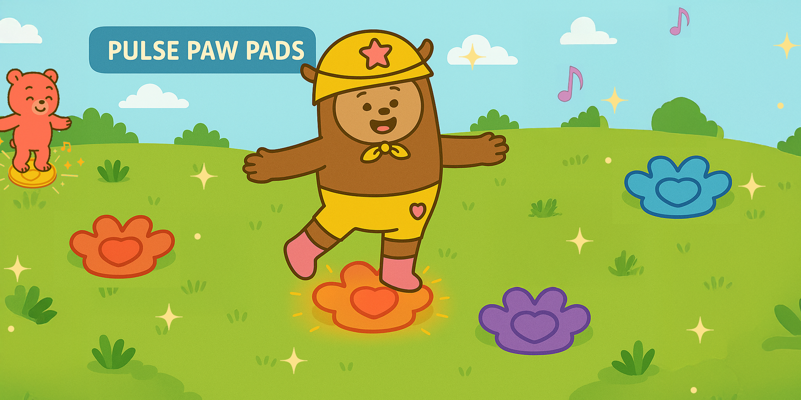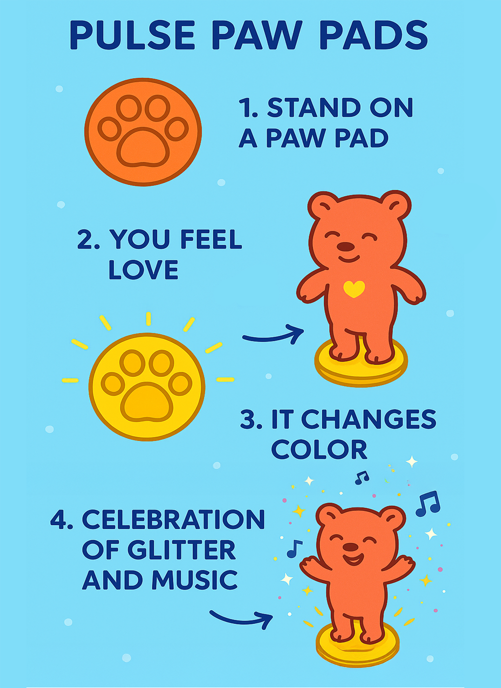 Pulse Paw Pads are soft, glowing spots hidden across the Heart-Light Field—each shaped like a big bear paw with a heart in the center. But these pads don’t respond to your feet... they respond to your frequency.